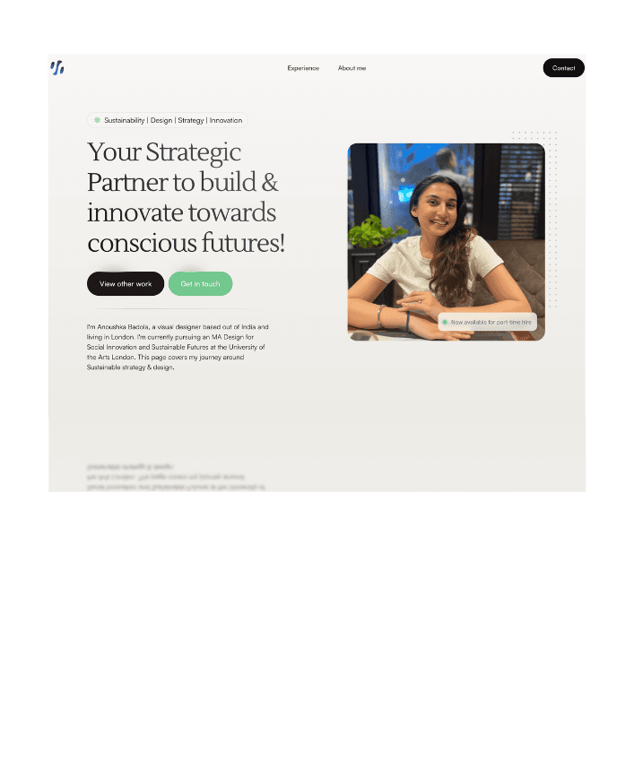 I'm a Visual Designer from India, who's currently living in London to pursue her Masters in Social Innovation and Sustainable Futures from the University of the Arts London! I have had an interesting journey with design,I'm a curious individual so my career has been a testament of exploration! As I'm learning more about sustainable futures I'm keen on taking up opportunities that help me understand conscious futures as a firsthand experience. I'm excited to indulge in innovative opportunities to tackles issues with effective strategies and innovative design solutions.